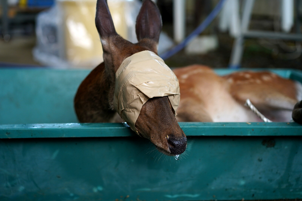 理想的な血抜き温度管理を目指してわれわれが取り組んだのは罠による捕獲のあと個体を生け捕りにして施設まで持ち帰るというものです。
